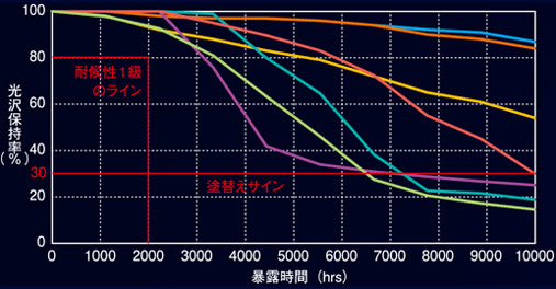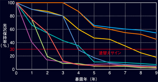 宮古島は本州に比べ、3倍以上塗膜の劣化があると言われており、 他社フッ素樹脂塗料と比較して、きわめて高い耐候性能を有しています。 光沢保持率が30%を下回ると、塗替えのサインとなります。